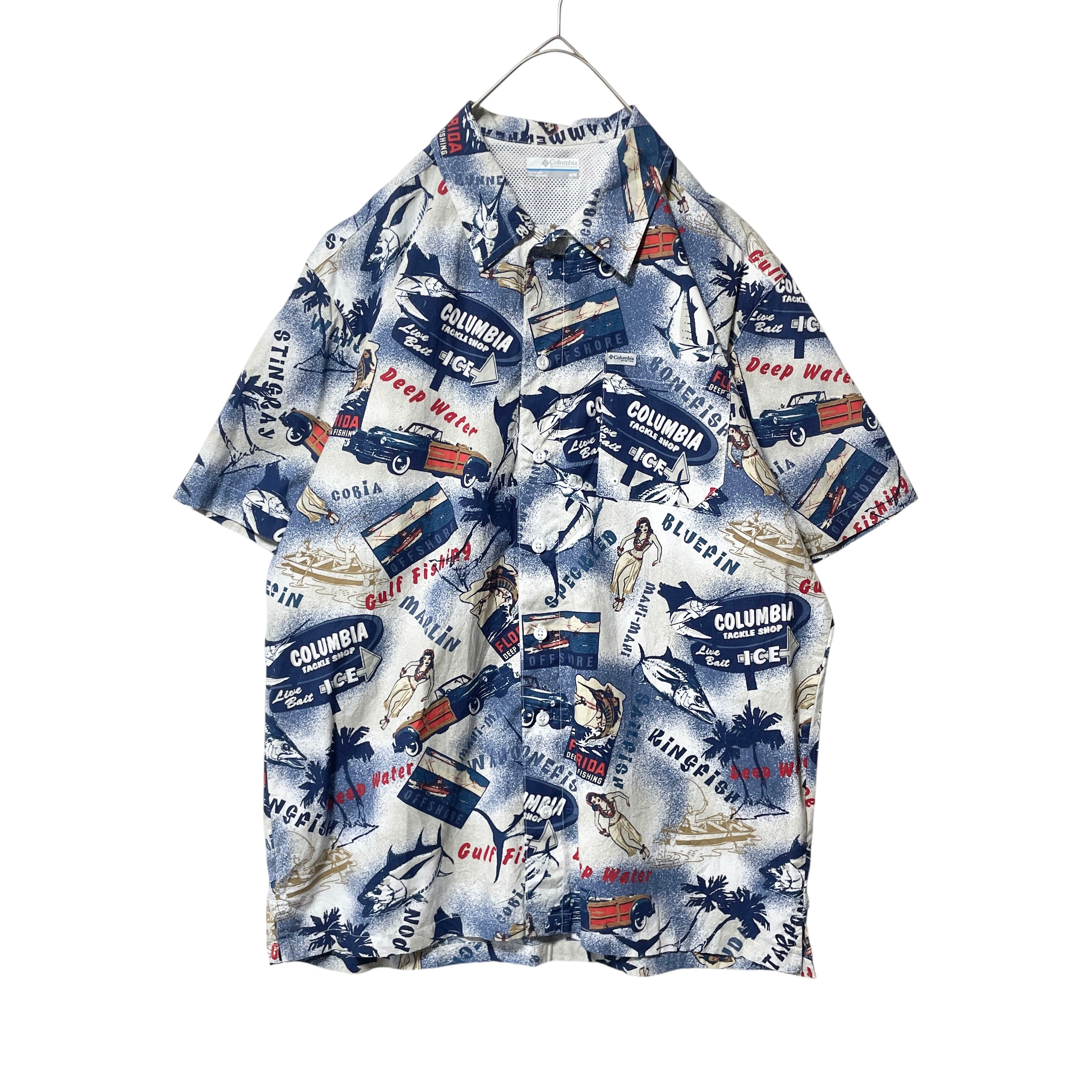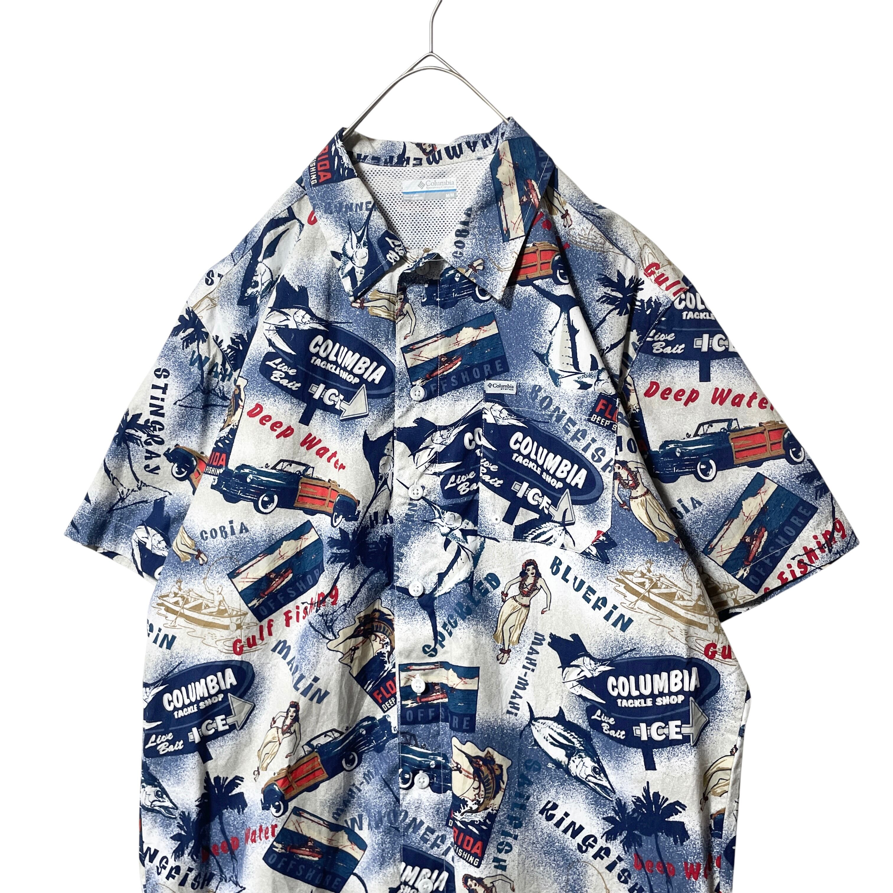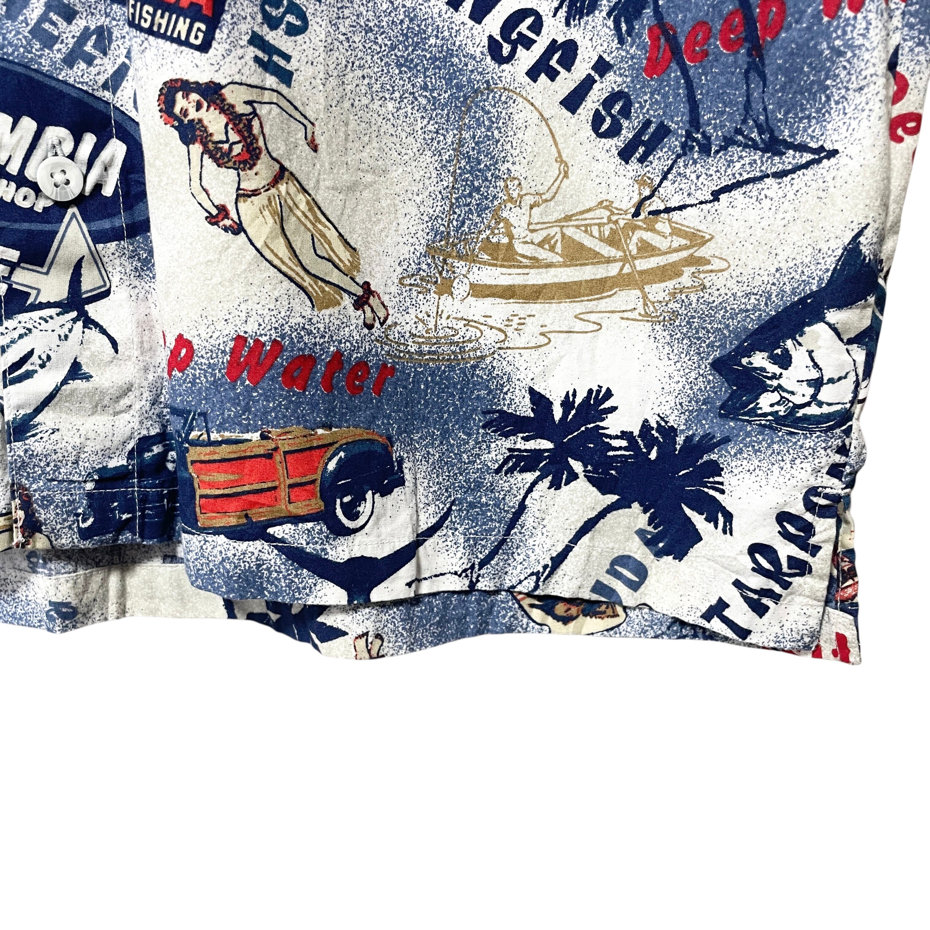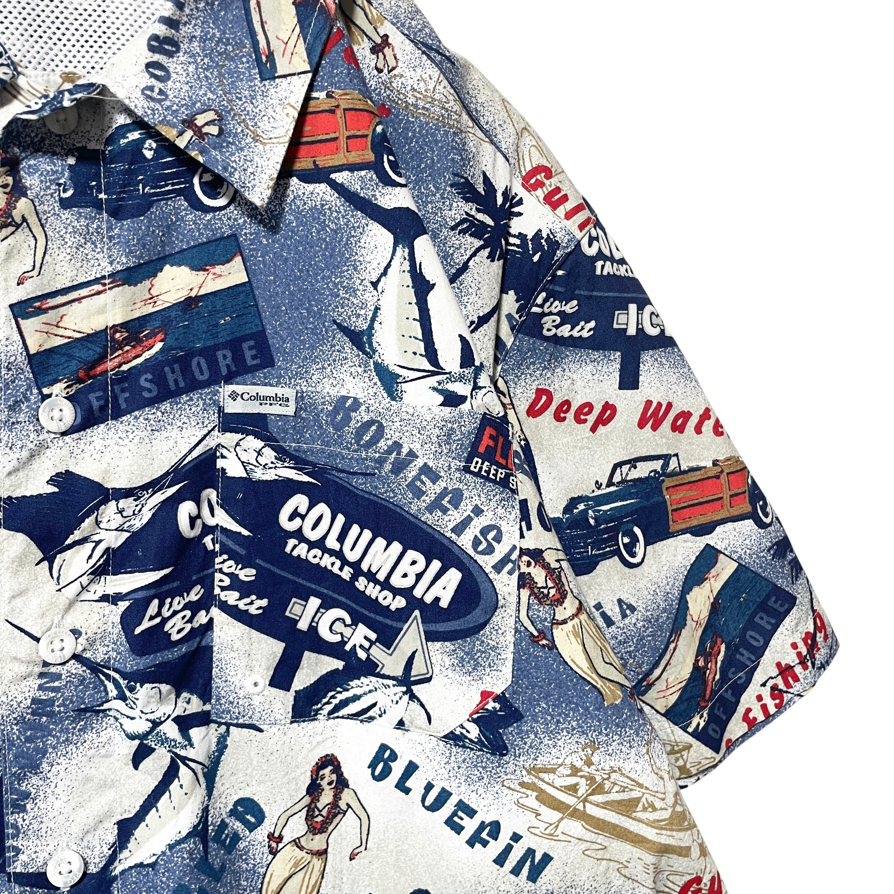 古着 コロンビア PFG 総柄半袖シャツ 魚 船 フラダンス ネイビー メンズM