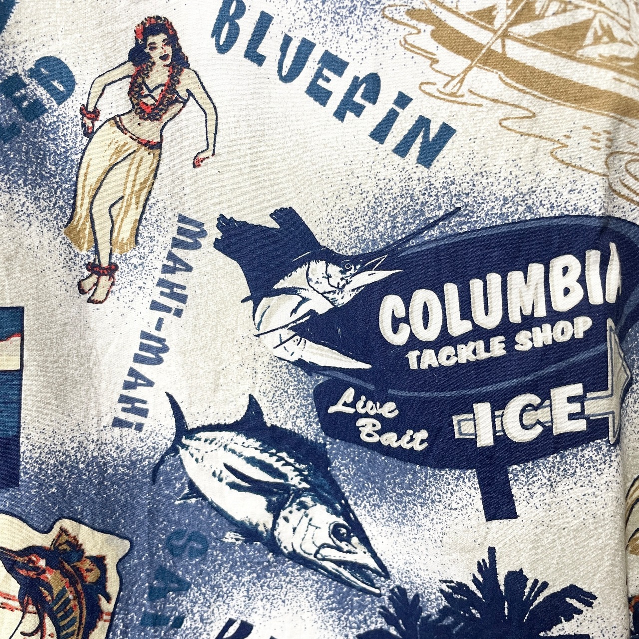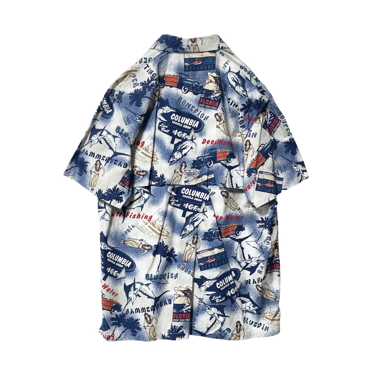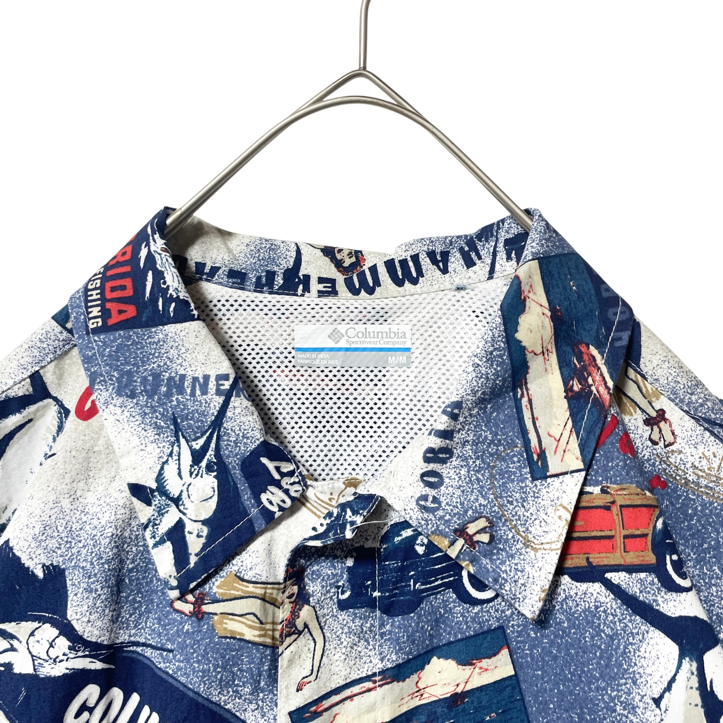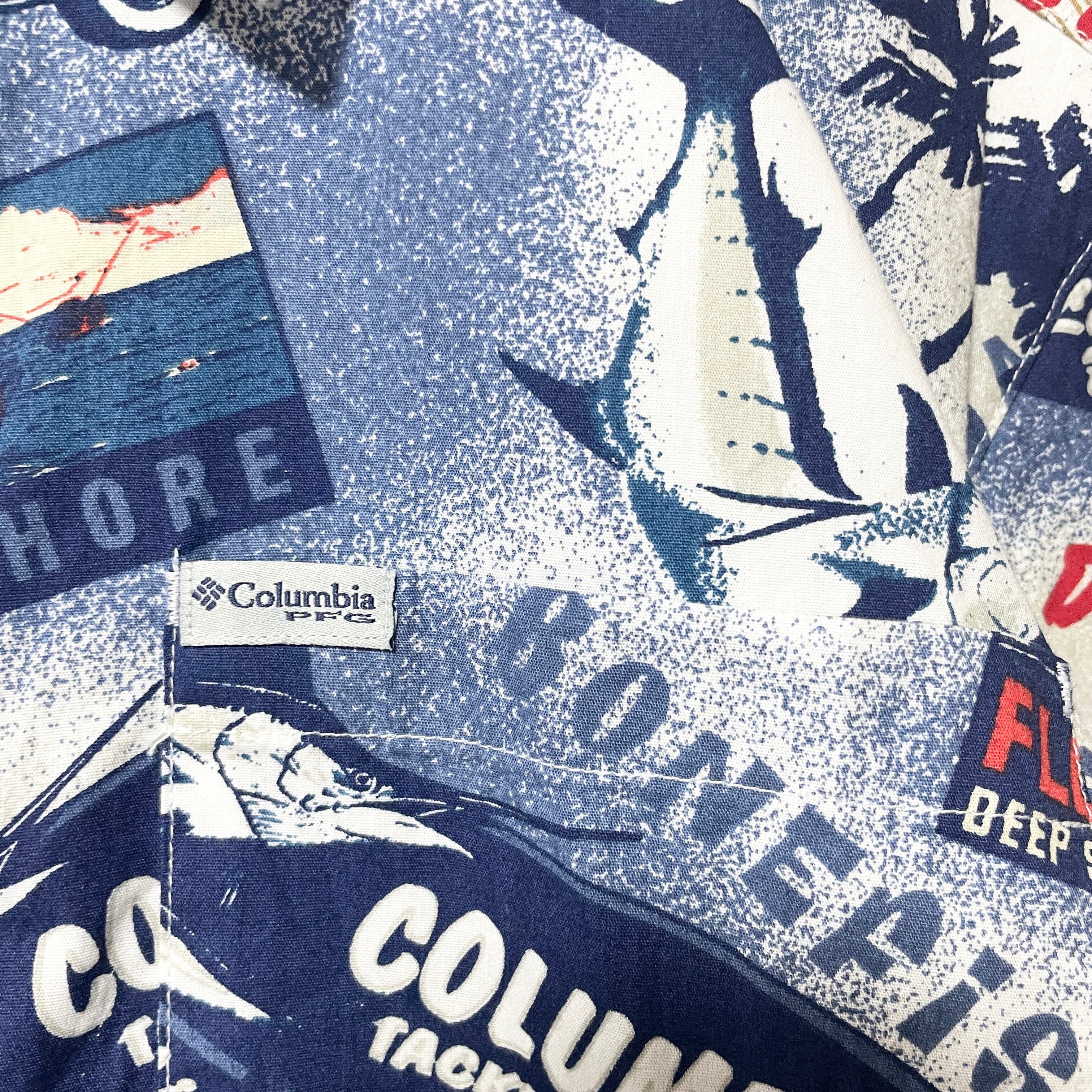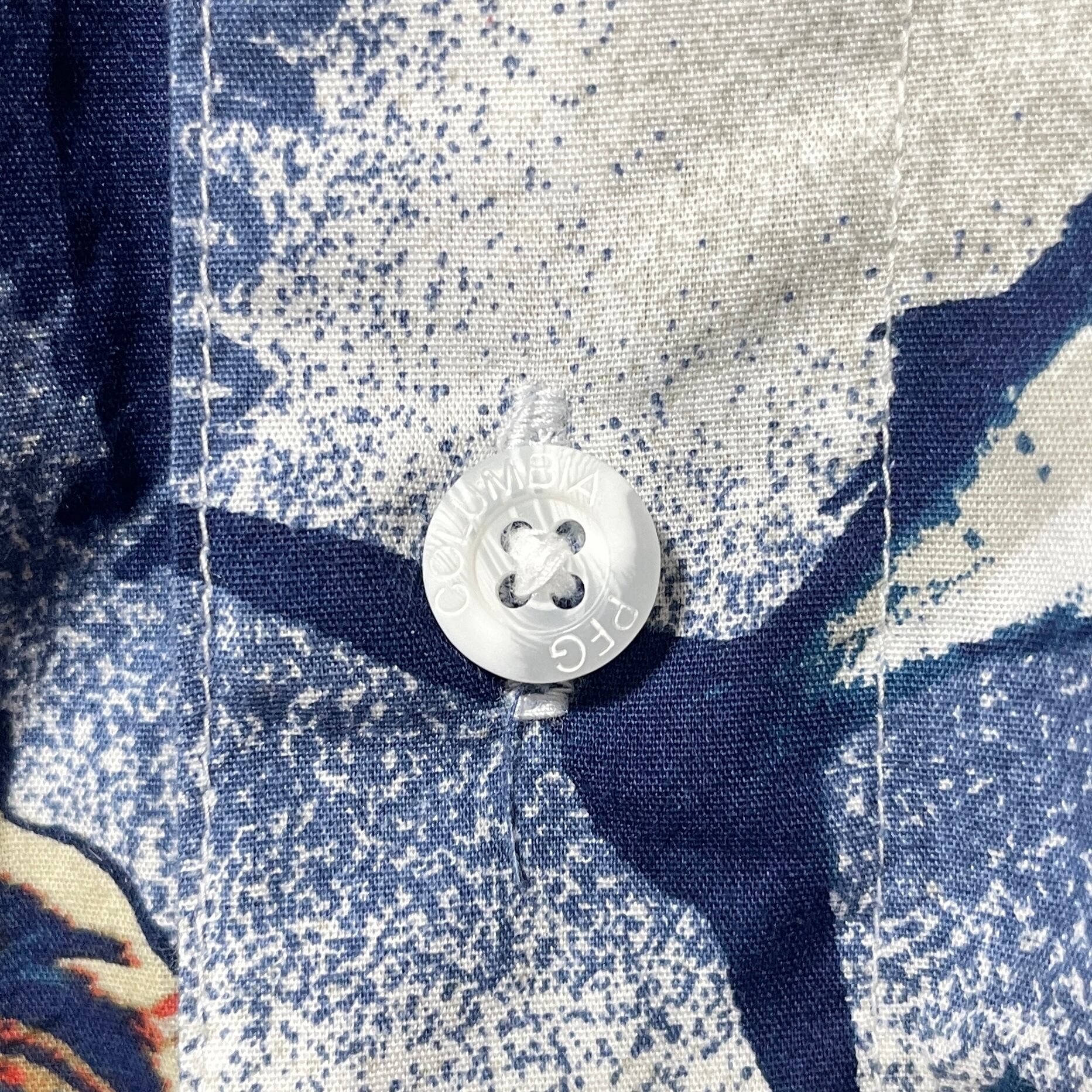 古着 コロンビア PFG 総柄半袖シャツ 魚 船 フラダンス ネイビー メンズM