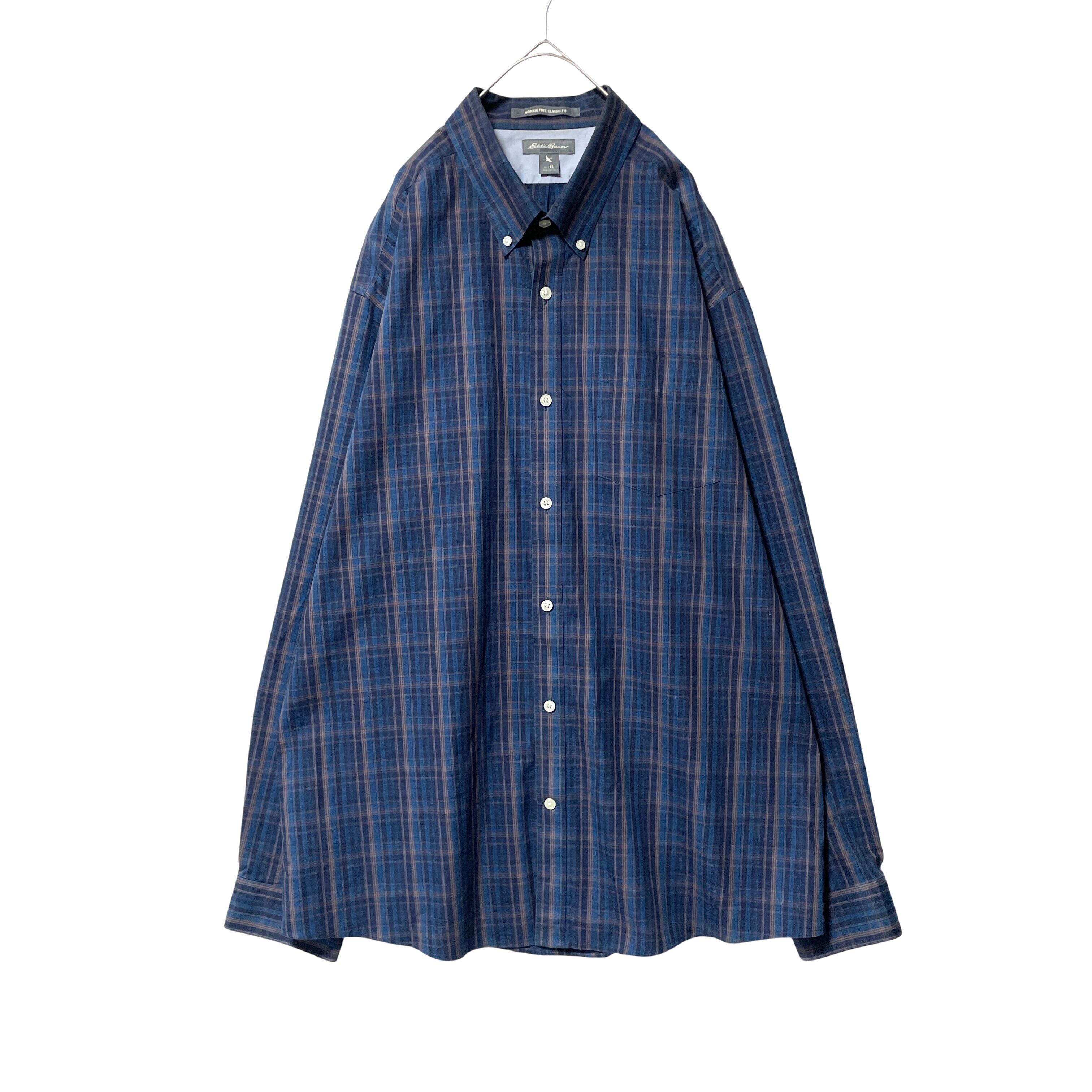 エディーバウアー リンクルフリー ノーアイロン チェック柄 長袖シャツ 紺 XL