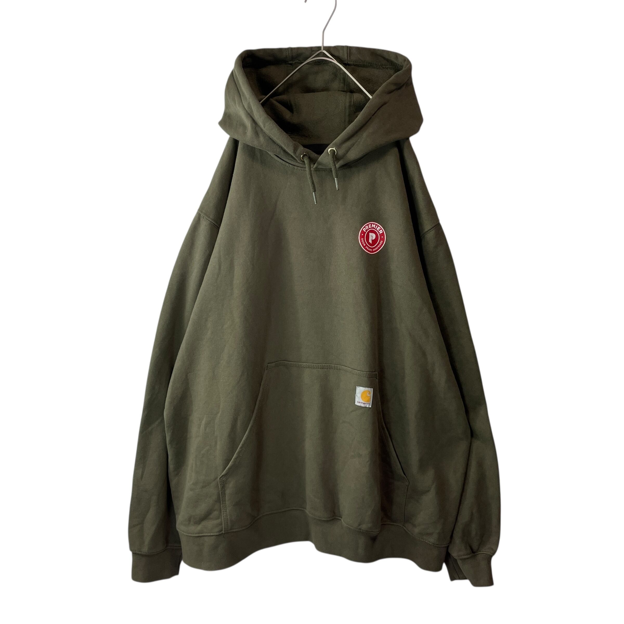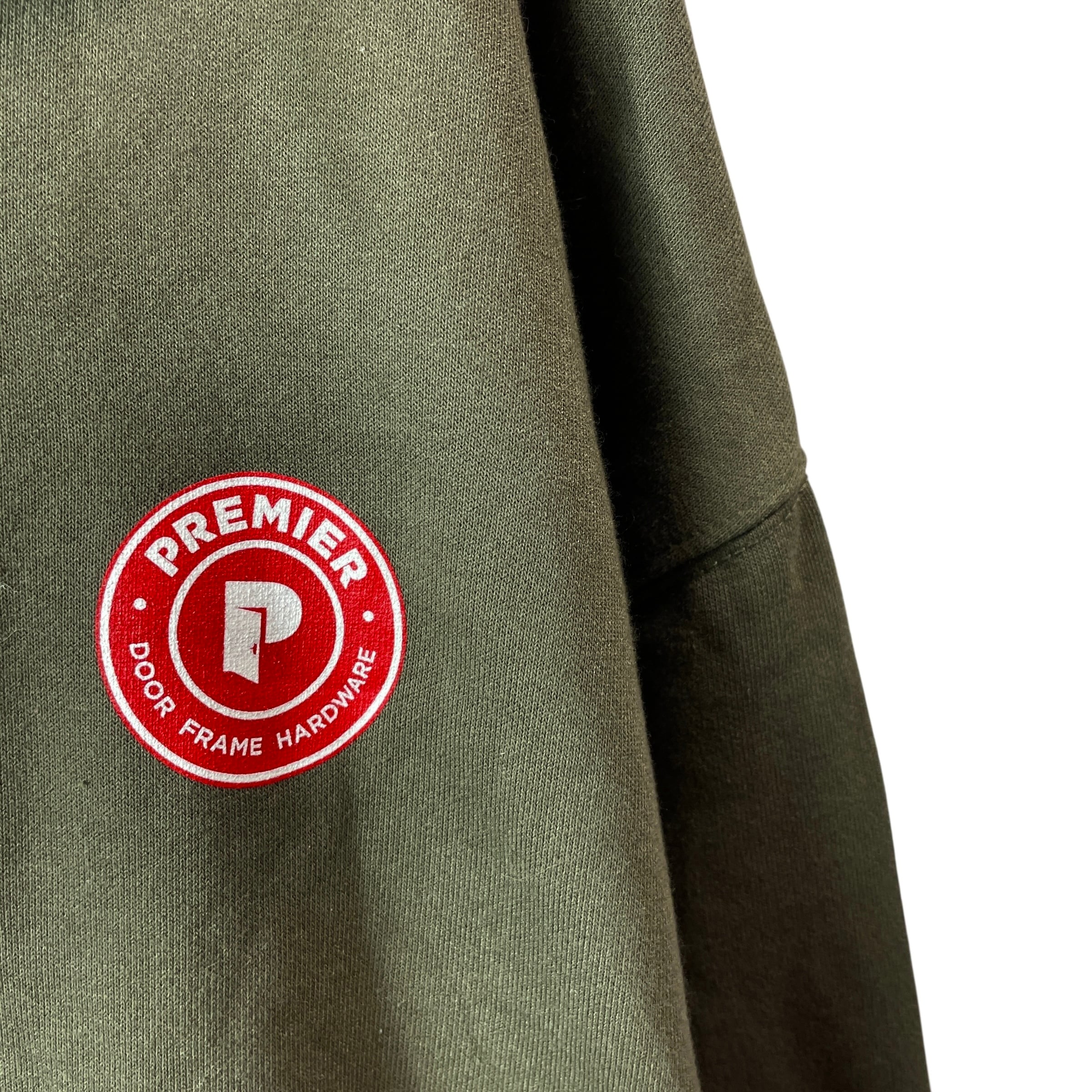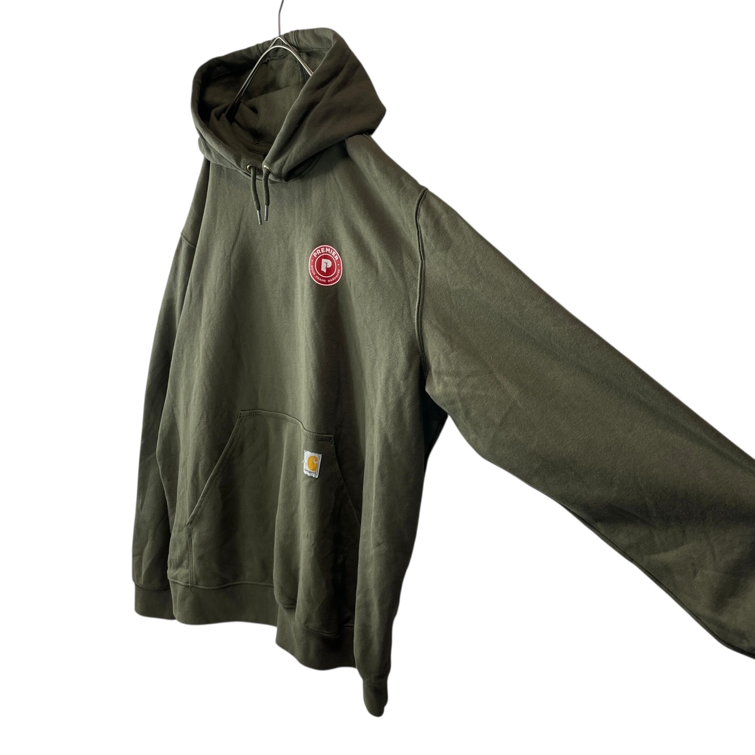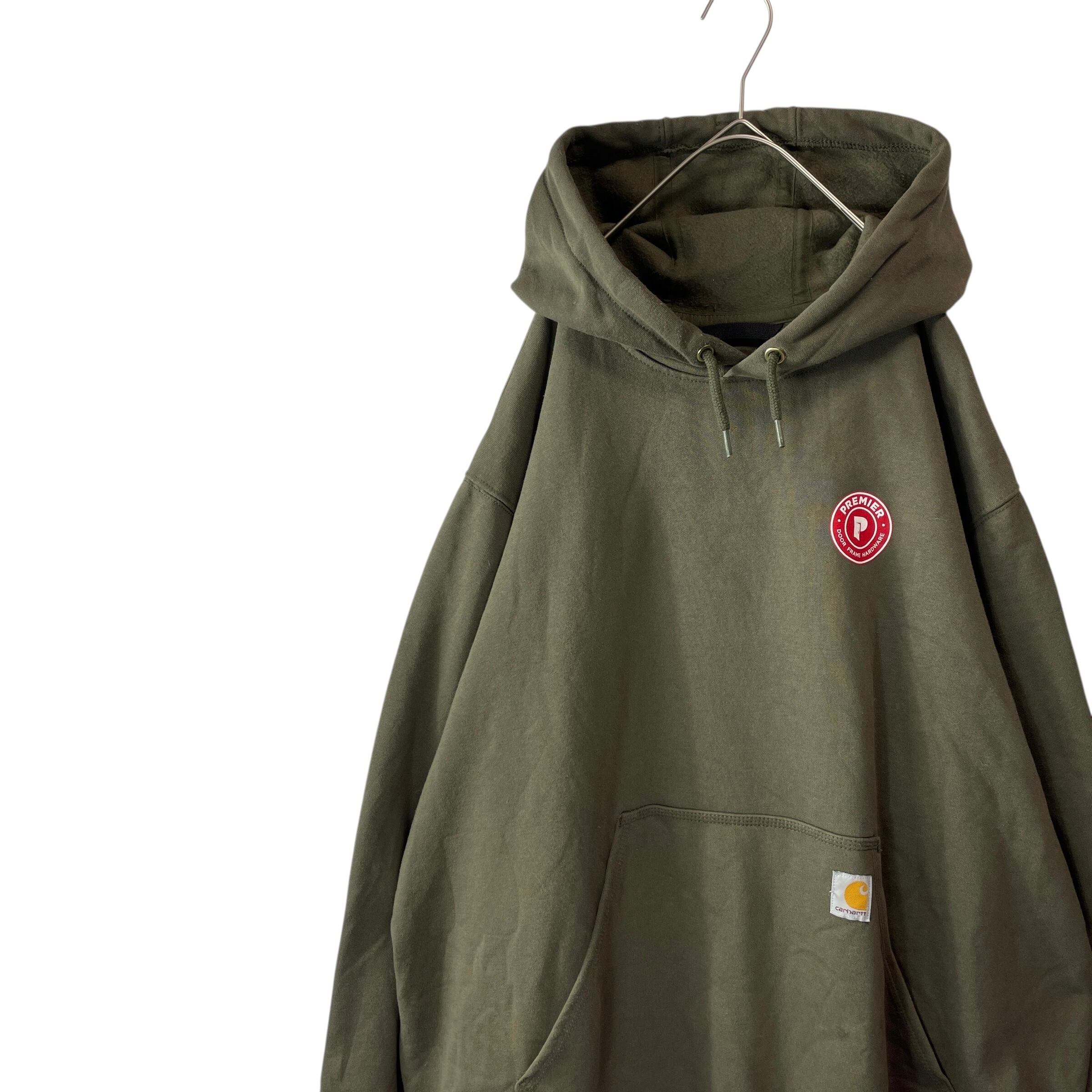 Carhartt(カーハート)の企業ロゴスウェットパーカー。フロントに大きく入った「Premier Door Frame Hardware」ロゴが映える一点物デザインです。ビッグサイズの2XLで、男女問わずゆったり着られるシルエット。アメリカ古着らしい存在感あるプリントと、Carharttならではの丈夫なボディが魅力のアイテムです。目立つダメージや汚れもなくまだまだ長く着用いただける一着です。