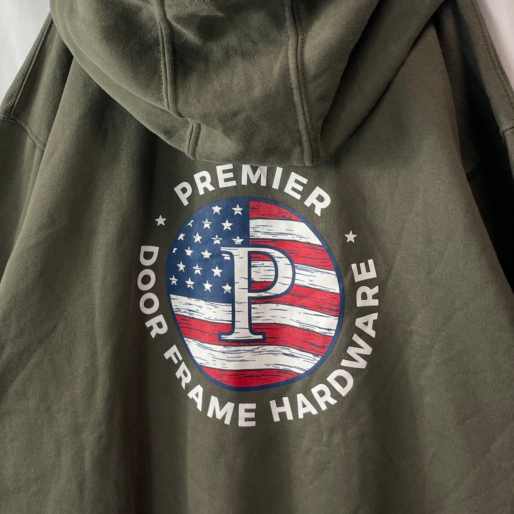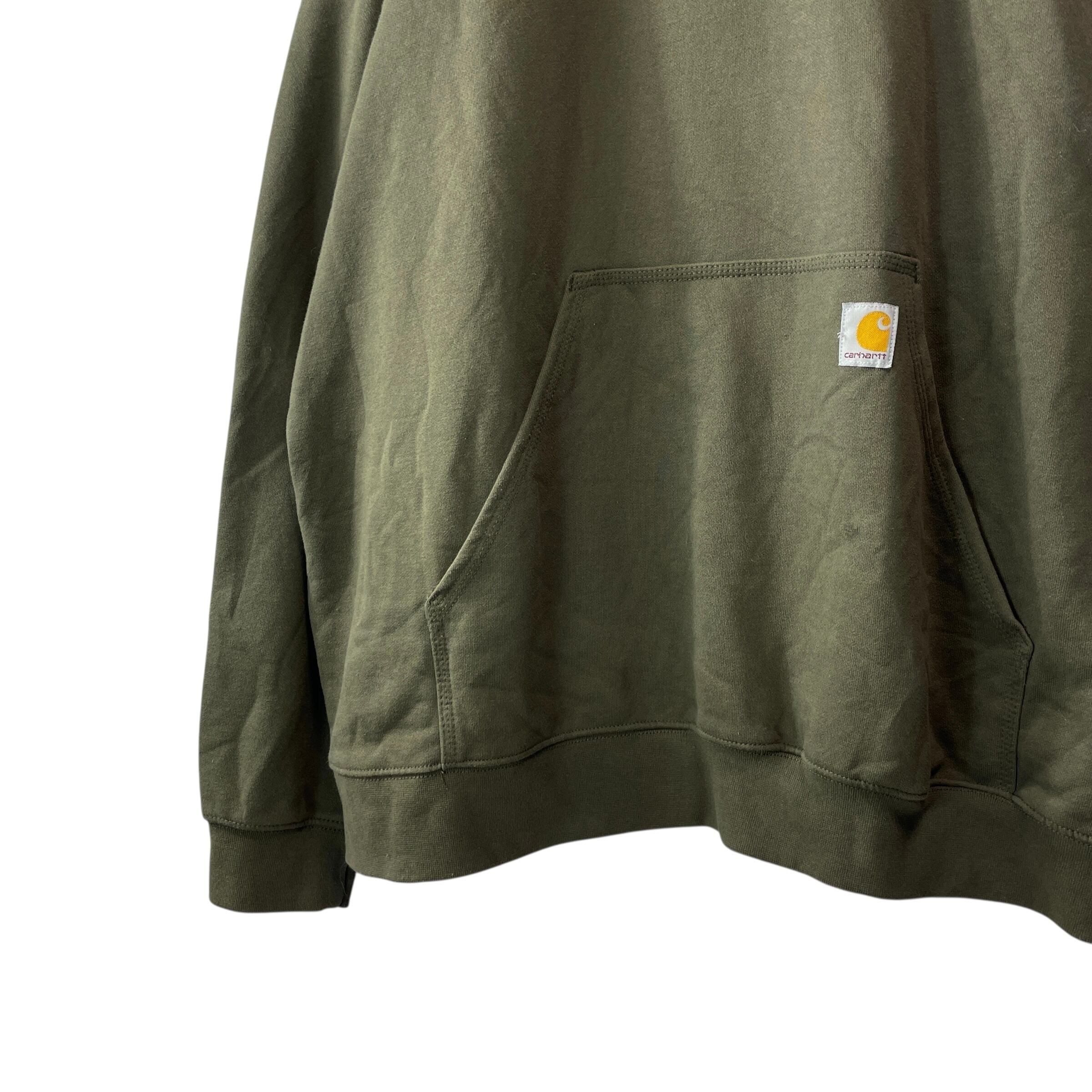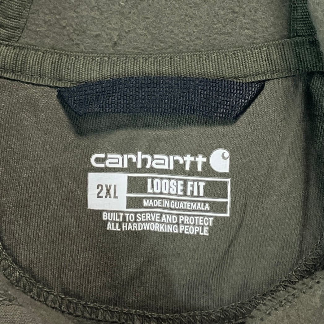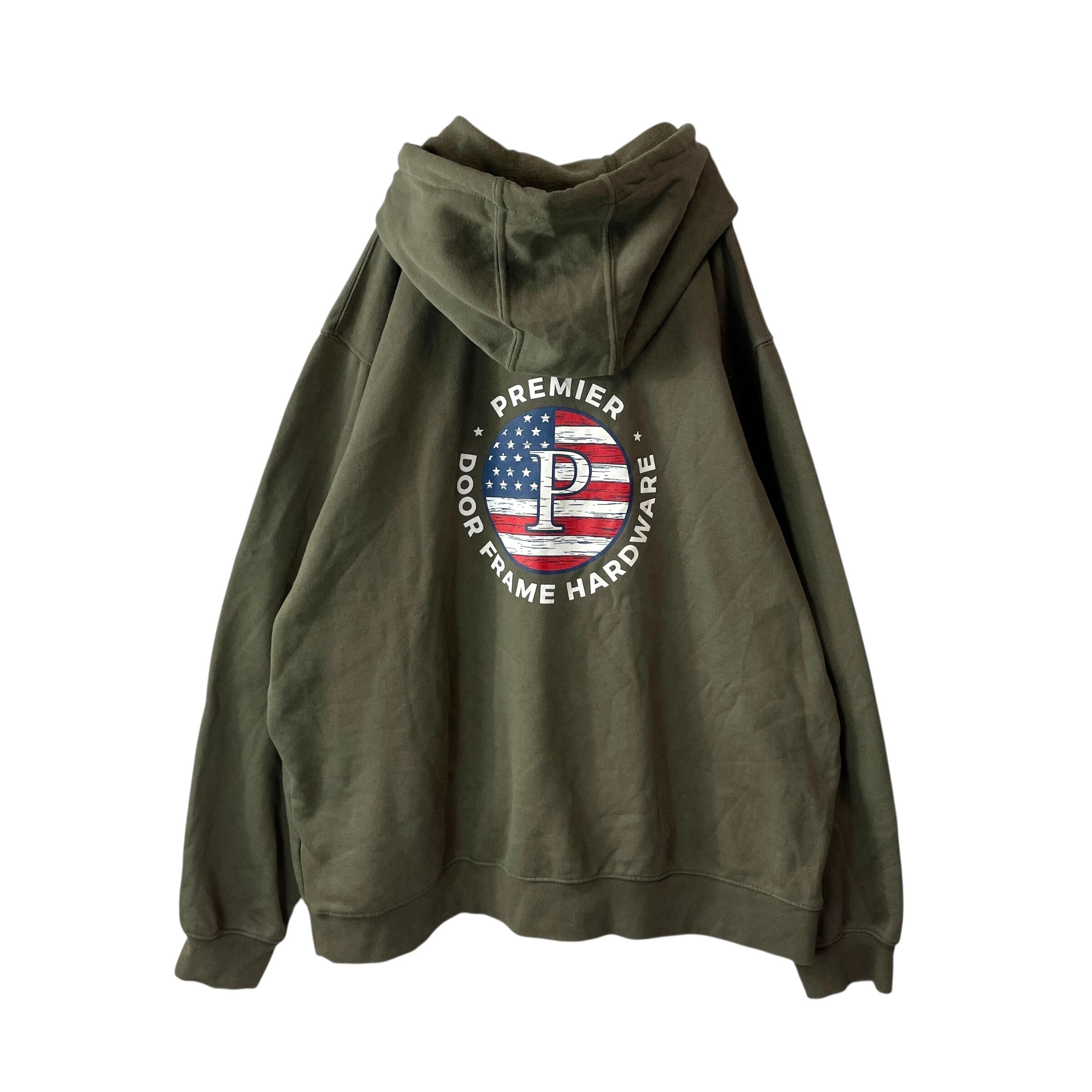 Carhartt(カーハート)の企業ロゴスウェットパーカー。フロントに大きく入った「Premier Door Frame Hardware」ロゴが映える一点物デザインです。ビッグサイズの2XLで、男女問わずゆったり着られるシルエット。アメリカ古着らしい存在感あるプリントと、Carharttならではの丈夫なボディが魅力のアイテムです。目立つダメージや汚れもなくまだまだ長く着用いただける一着です。