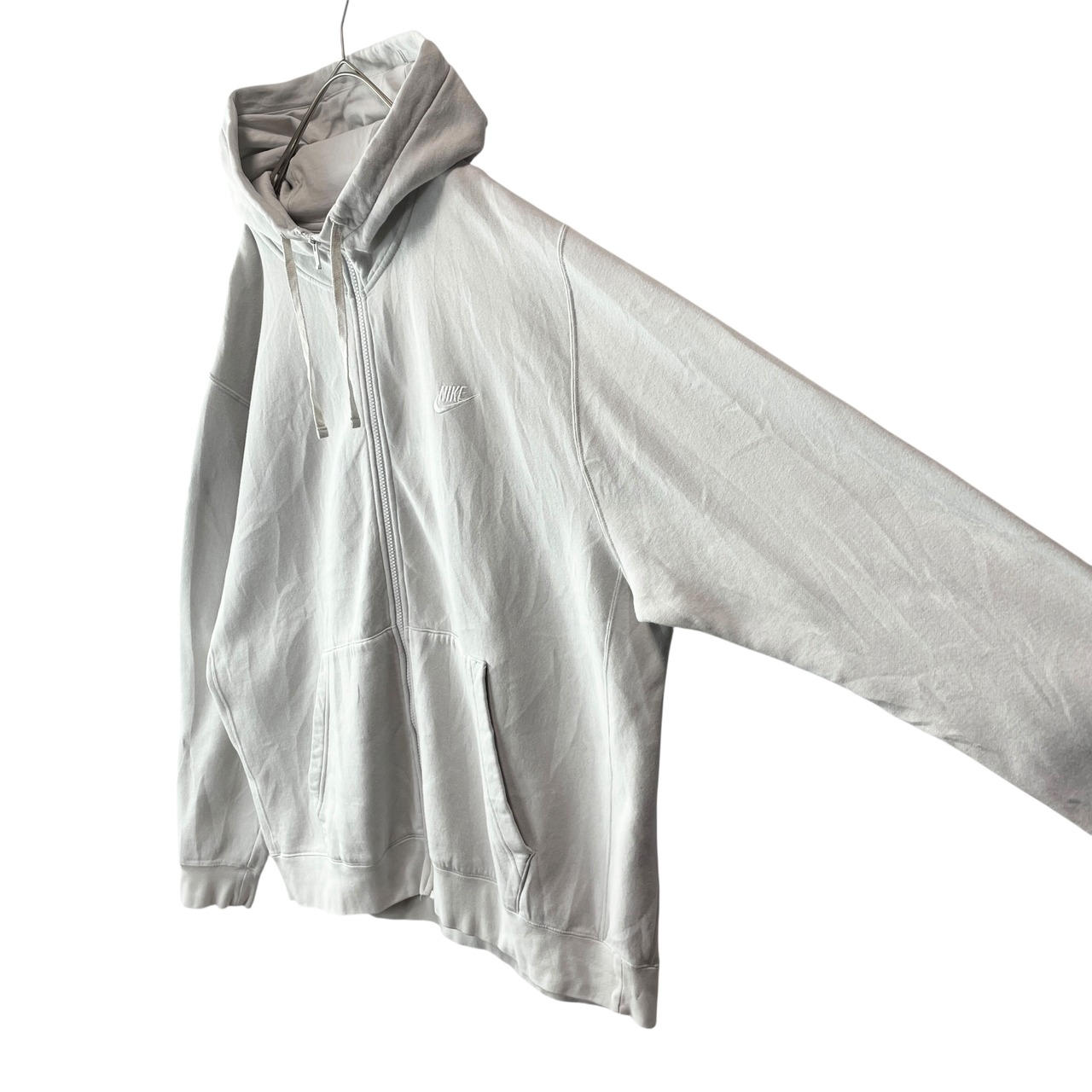 白に近い明るいグレーカラーになります。大きいサイズでだぼっとゆるく着用したい方や体格が大きい方におすすめです。フード横に小さな汚れがございますが、その他目立つダメージや汚れもなくこれからまだまだ着用出来る商品です。