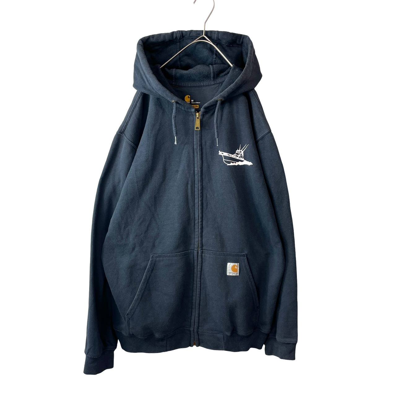 海外古着 カーハート ジップアップパーカー バックプリント フェードネイビー M