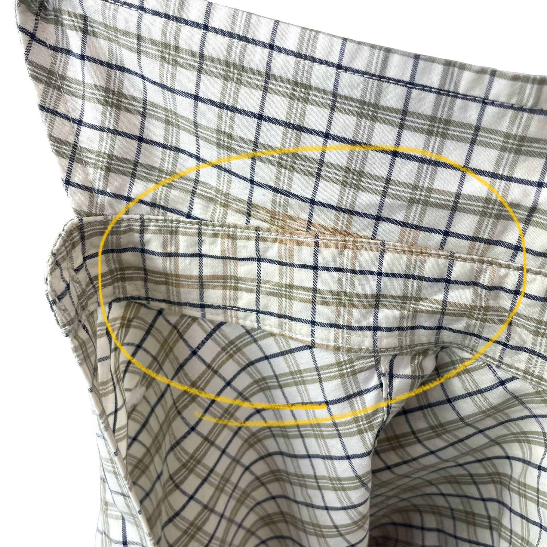 ▲襟元内側 チェックの変色箇所あり。赤茶色になっている場所がございます。写真にてご確認ください。着用すると見えにくい場所にはなりますが、少しでも気になる方はご購入はお控え下さい。
