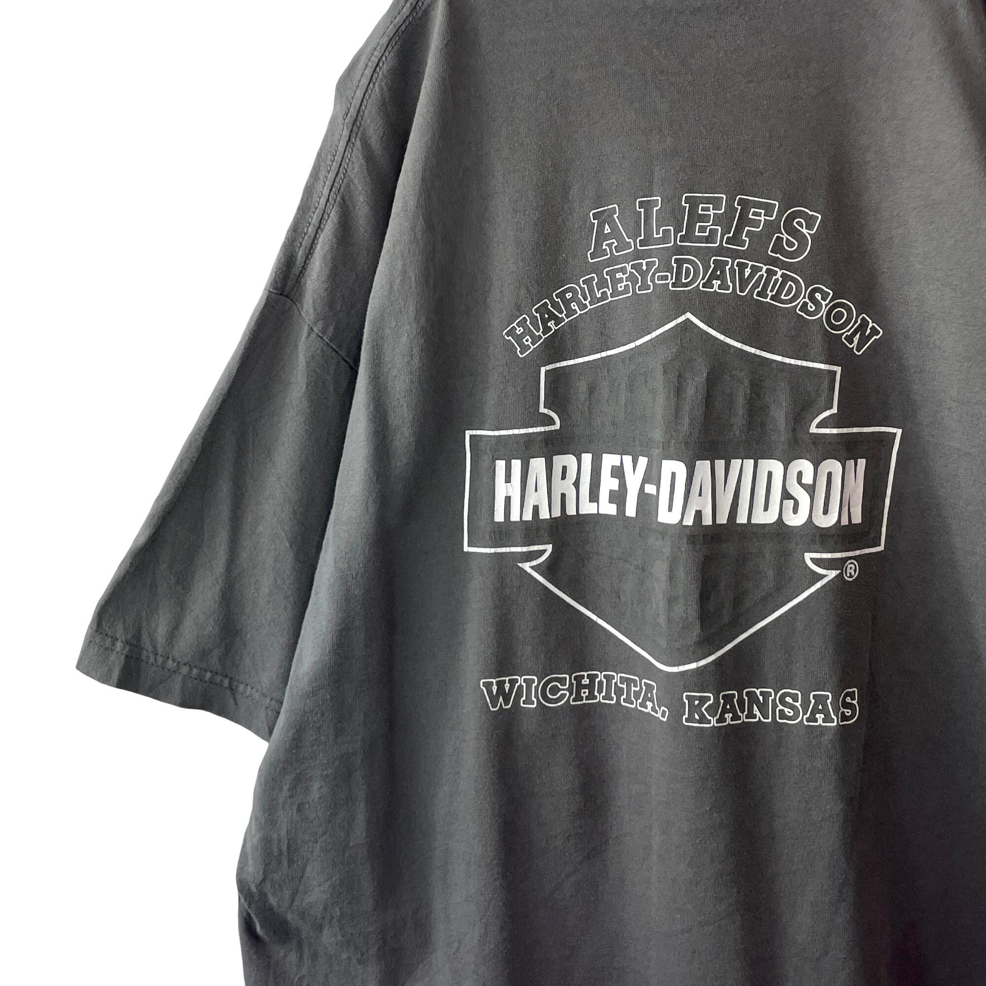 ✅カンザス州ウィチタの老舗ディーラー「ALEFS」限定のハーレーTシャツ。表面のクラシックなフォトプリントに対し、背面はあえて色を使わず、白のラインアートだけで表現された「バー&シールド」ロゴ。両面プリントですが落ち着いた雰囲気のデザインです。