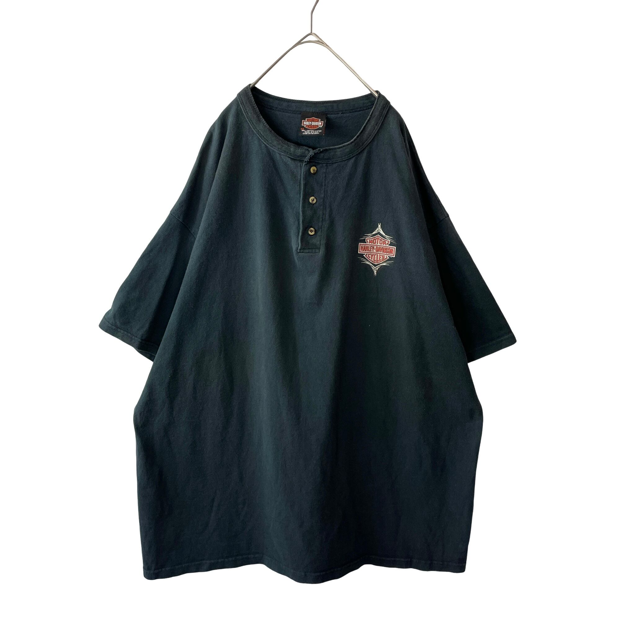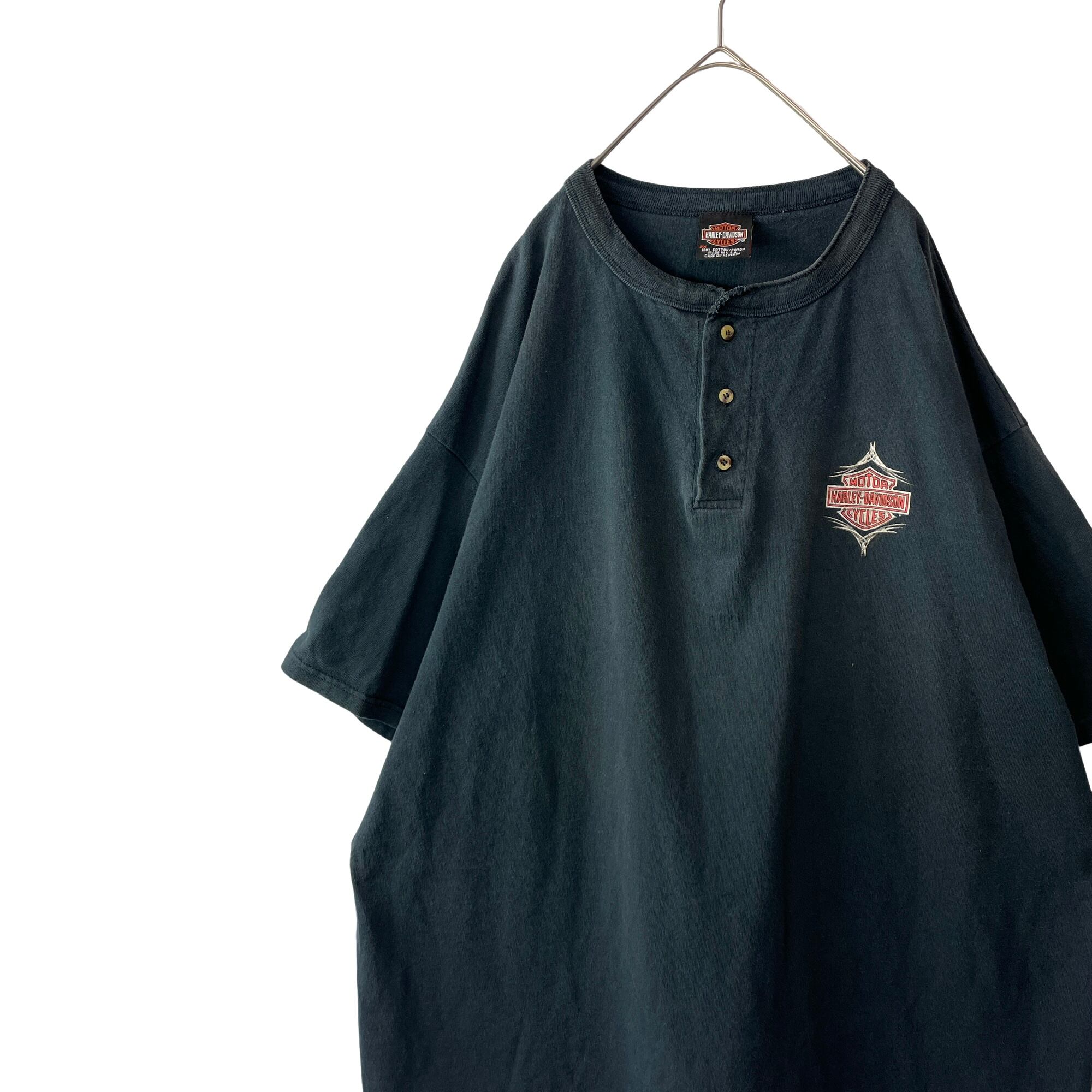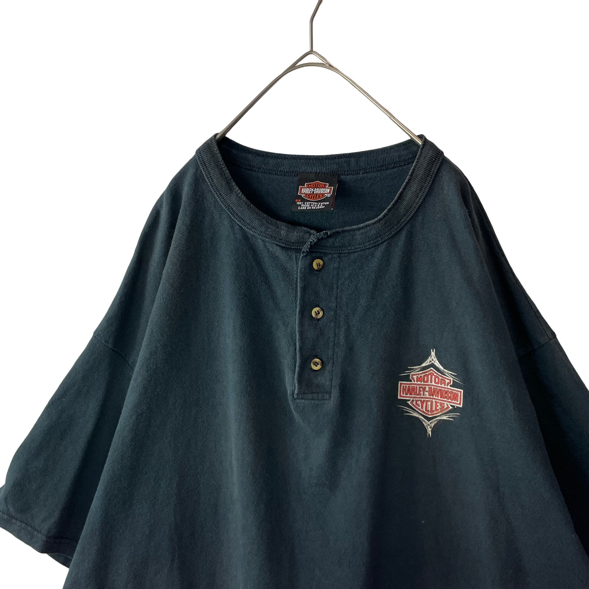 【希少】USA製 ハーレーダビッドソン 2XL ヘンリーネックTシャツ 墨黒
