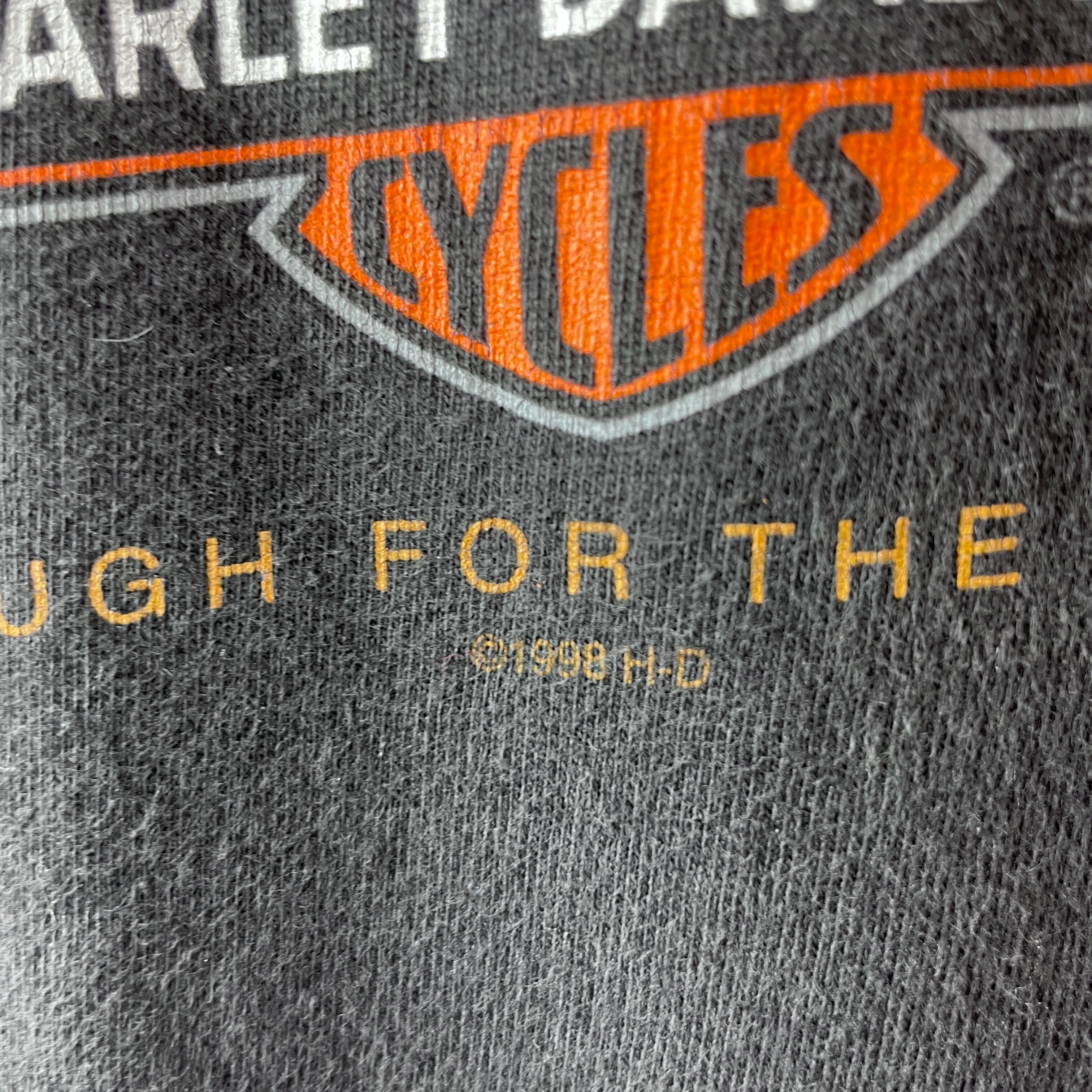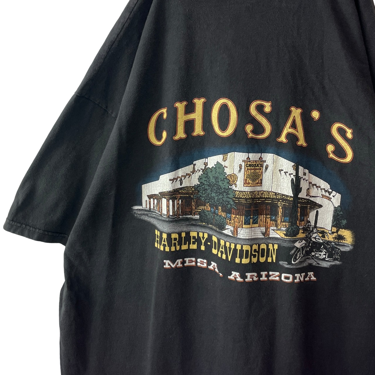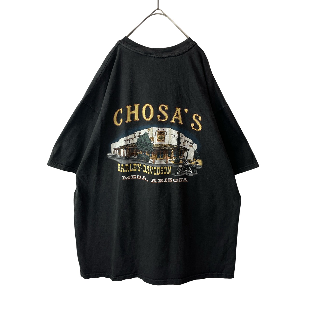 ✅1998年コピーライト入り、米国製のハーレーダビッドソンオフィシャルTシャツ。アリゾナ州メサの旧ディーラー「CHOSA'S」のレトロなグラフィック魅力の商品。