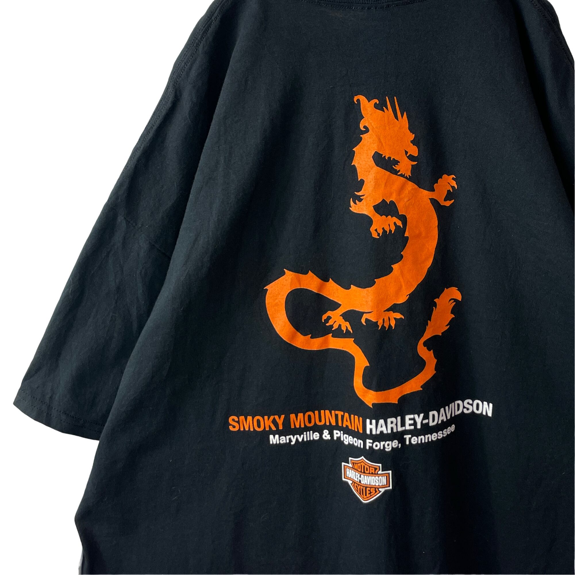 ✅背面に大きく描かれた力強いドラゴンのグラフィック。ハーレーの中でも珍しいモチーフで、オレンジの鮮やかなプリントがブラックボディに映える一枚。