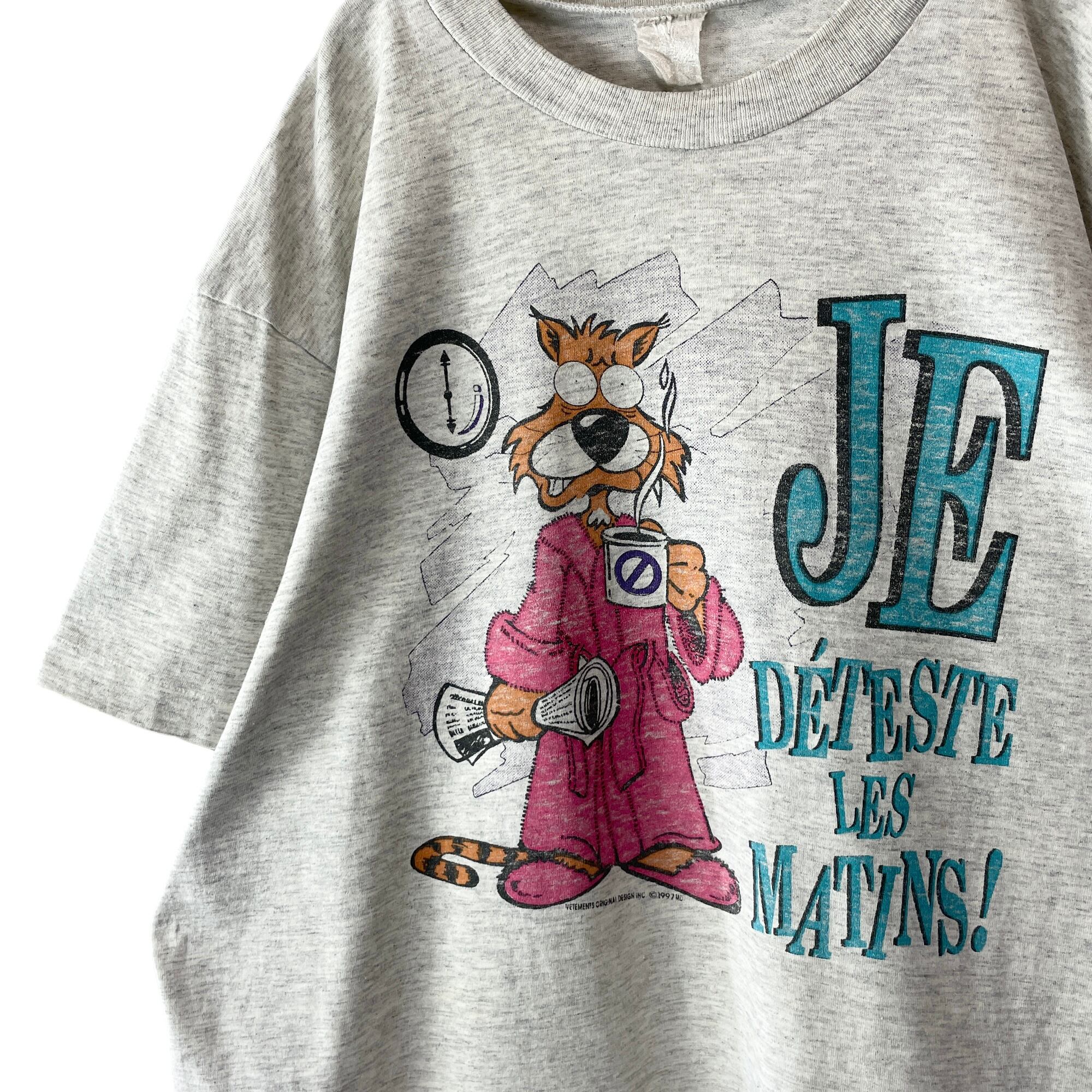 フランス語「JE DÉTESTE LES MATINS !(朝は大嫌い!)」のシュールなメッセージ。不機嫌そうなキャラクターが愛らしい、90sらしいポップな多色刷りプリント。